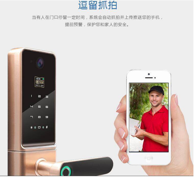 監控(kòng)攝(shè)像頭和智能鎖連接一體,起到有效防範和震懾作用,當有人在門口停留一定時間,係統會自動抓拍並傳送到手機,提前預警,保護家人安全。